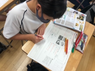 一年生の歴史の授業では、奈良時代の人々の暮らしについての学習をしています。歴史の授業は地理と違い、まとめは自分の言葉で行います。授業の最後の5分間、真剣に授業のまとめをしています。