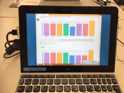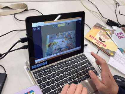 続いてロイロノートで、絵本の中の好きなページを写真に撮り、その絵にあるさまざまな物や色の名前を、英単語で記入する作業に取り組んでいます。作業が終わると先生に送ります。授業の最後には振返りのアンケートをロイロノートで提出し、その集計結果も生徒たちに送られます。(副校長)