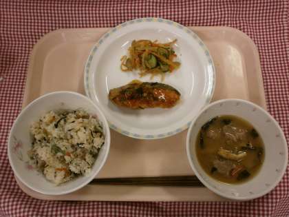 それにちなんで、今日の給食は「噛み噛み献立」です。ごはんやサラダ、汁物に豆やさきいか、ゴボウなどの食材をいれました。よく噛んで食べてください。