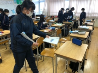 「6時間目、地理じゃなくて道徳だよ!」という私の声とともに慌てて準備が始まった6時間目の1-5の道徳。連絡の行き違いがあり、準備が遅れてしまいましたが、係じゃない生徒も迷いなく教科書の配布を手伝っていました。