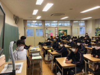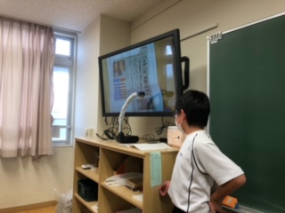 終学活のNIEタイムでは記事がよく見えるように拡大投影機を使用しました。記事の見出しや写真がよく見えるようになりました。投影機の準備は近くの席の人が快く引き受けてくれました。