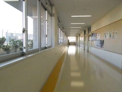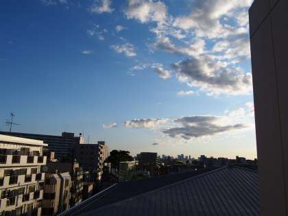 4階の北側廊下の風景です。秋空の向こう側には新宿の高層ビル群が見えます。