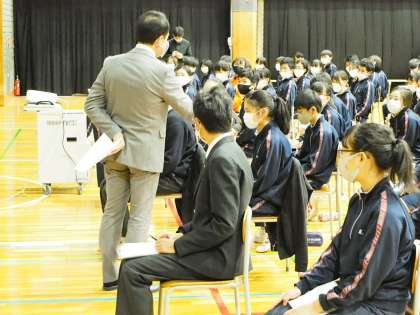6校時の進路ガイダンスは都立狛江高校の校長先生を講師としてお招きいたしました。現役の都立高校の校長先生からマイクを向けられる場面もたびたびみられ、相当緊張した様子の9期生でした。
