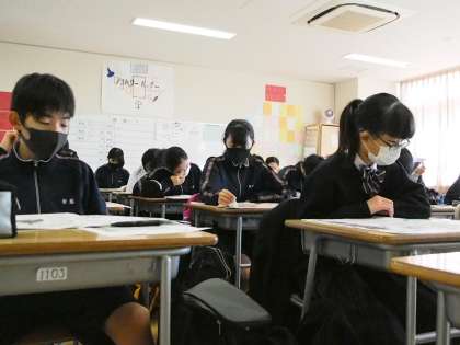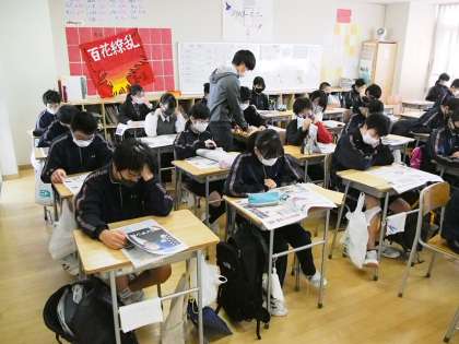 保護者の方があいさつ運動に参加していただいているちょうどその時間の1年1組の教室ではNIEタイムの真っ最中です。真剣な表情で新聞を読む表情をみると、中学校に入って成長した姿を感じます。