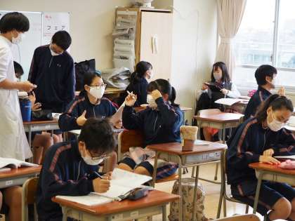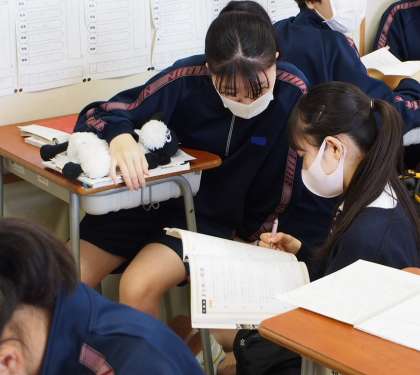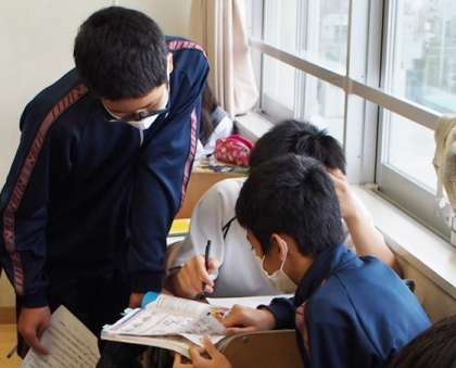 試験前にも関わらず、10期生のフロアから何やら賑やかな声が。そう、このクラスでは、友達同士で最後の追い込み、確認作業をしています。担任である理科の先生も音楽の問題について聞かれしっかり答えていました。