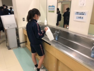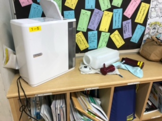放課後になると保健給食委員が加湿器の整備をしています。乾燥から教室を守るために毎日頑張っています。