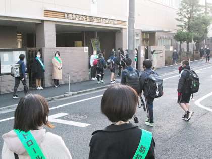 1年2組の保護者の方にご協力をいただいき、あいさつ運動がスタートしました。早朝からたくさんの方に声をかけていただき、生徒も笑顔で登校しています。ありがとうございました。