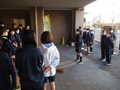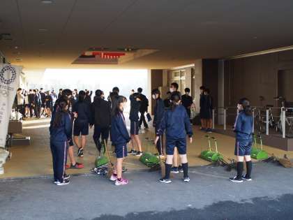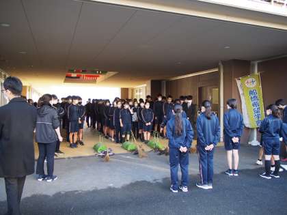 昨日の曇天から一転、澄みきった秋の空で始まった落ち葉ひろいボランティア活動です。7時40分ころから続々と集まってきた9期生です。説明のために列の前に生徒が立つと、それまでのざわめきが徐々になくなり静寂が訪れます。この小集団でもきちんとフナキボ流になれるのが3年生。さすがです!