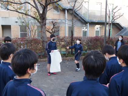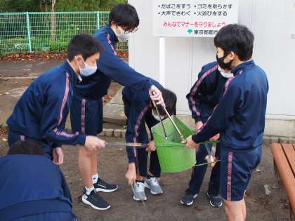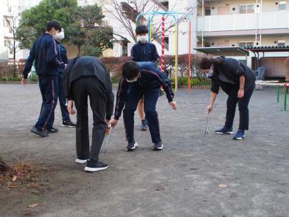 学校の前の公園では、いつもゴミを拾っているという近所の方が「あらっ、どうしたんですか?」と尋ねてきたので、落ち葉拾いボランティアの活動の話をすると「えらいですね。頑張ってくださいね」と励ましのお言葉をいただきました。