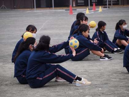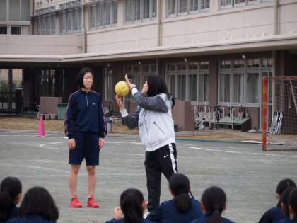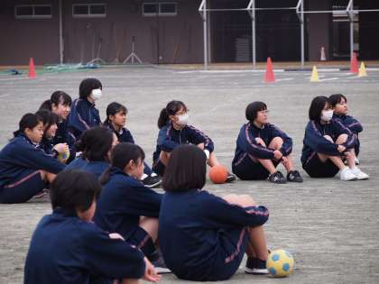 先生からパスを続けるためのアドバイスを聞くフナキボ生です。「回転をつけると取りやすくなります」と聞いてすぐにやってみる。この素直な姿勢もフナキボ生らしい!