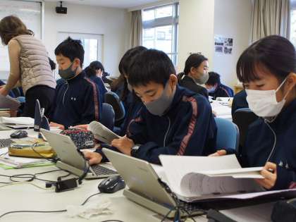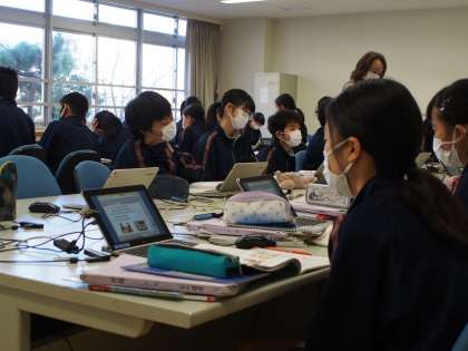 11期生がパソコン室でひとりずつモニターのデジタル教科書を見ながら発音をしています。来年度全校生徒にタブレットが貸し出されると、教室でこの授業ができるようになるかもしれません。