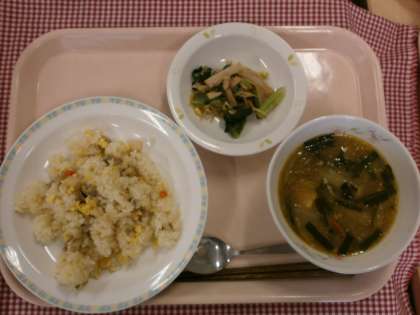 今日の主食は、「焼き豚チャーハン」です。サイの目にした焼き豚とかまぼこやにんじんなどの具を炒めた後にご飯と合わせました。食べやすい味になっていると思います。残さず食べてください。