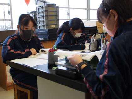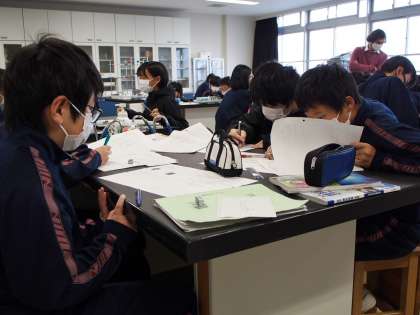11期生の理科は、授業中に資料を使って調べ学習の最中です。こういう時も黙々と調べ物をする姿にフナキボらしさを感じますね。