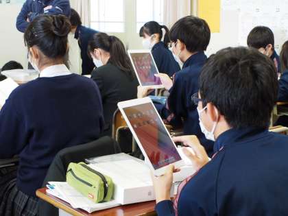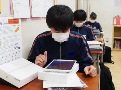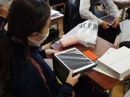 さっそく電源を入れてみると、鮮やかな液晶画面が現れます。液晶の上に貼ってあるフィルムがもったいなくてはがせない、と言っている生徒も。その気持ち、大切にしてくださいね。来年には全学年の生徒に配られる予定です。