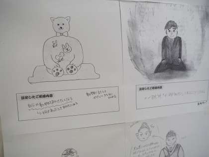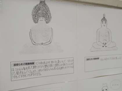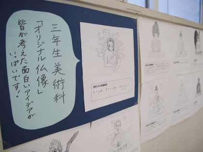 今朝、校内を回っていると9期生の廊下でとても興味深い作品群を発見!美術のオリジナル仏像です。「これを拝めば生涯○○ができる」「○○になれる」という解説のアイデアのユニークさもさることながら、みんな仏像の描き方のクオリティーも高くてびっくりです。実際こんな仏像があったらすぐ拝みにいくのになあ…というものも多数ありました。