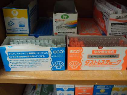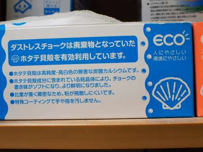 19世紀にヨーロッパで石灰岩を原料として誕生したチョークですが、現在は炭酸カルシュウムが主成分です。フナキボで使用しているチョークは、ホタテの貝殻を細かく砕いたものが入っています。年間20万トンにもなる貝殻の廃棄物を有効利用するすることで地球環境にも配慮し、しかもチョークの粉が舞い上がることを防ぐ効果もあるという優れものです。