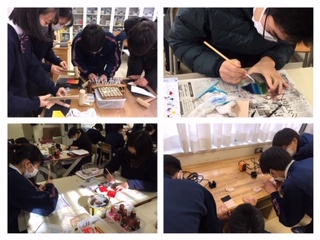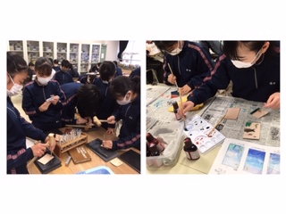 いよいよ革工芸の染色、打刻、くりぬきなど、デザインの加工に入っています。デザインによってそれぞれ加工する順番や使う道具が違うので、班や進度に応じて生徒同士でアドバイスをしながら進めています。みんなとても楽しそう。限られた時間の中で着々と進めています。(岩崎)