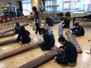 放課後の音楽室を覗くと、箏の練習をする生徒たちがいました。久しぶりの6時間授業の後でしたが、集中して練習していました。