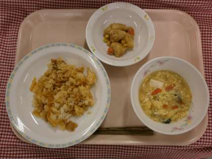 今日の主食は、「キムタクごはん」です。「キムタクごはん」は、キムチとたくあんが入ったチャーハンです。韓国の漬物のキムチの辛みと日本の漬物のたくあんの食感はとても相性がよく、疲労回復にきくといわれている豚肉も入っているので、とても体に良いごはんです。