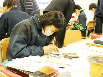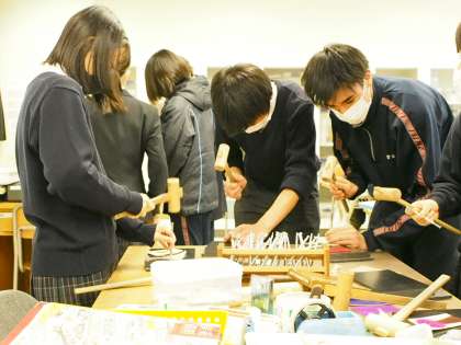 卒業製作ともいえる9期生の皮工芸も「刻印「焼印」の段階に入ってきました。どの顔を見ても、楽しさが加わった、いつもの真剣な表情をしています。
