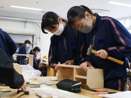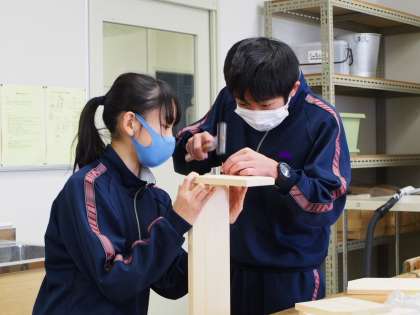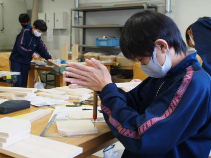 実技教科の時もフナキボ生の集中力には目を奪われます。それに加えて、作業しやすいように材料を支えてあげる生徒の協力度のすごさも画像から伝わってきますね。