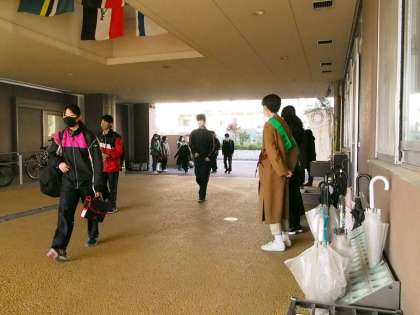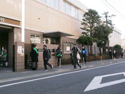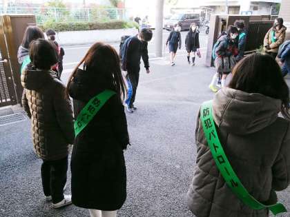 校門付近は特に朝陽が当たらない場所です。あいさつ運動に立っておられる1年5組保護者の方々にはこの時期申し訳ない気持ちでシャッターをきりましたが、そんな寒さも吹き飛ばすほどの大きな声でフナキボ生に「おはようございます」と声をかけていただきました。