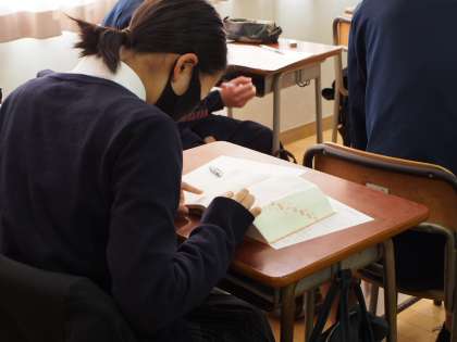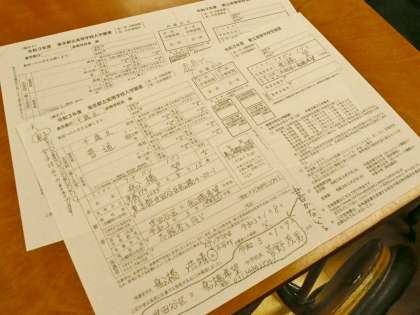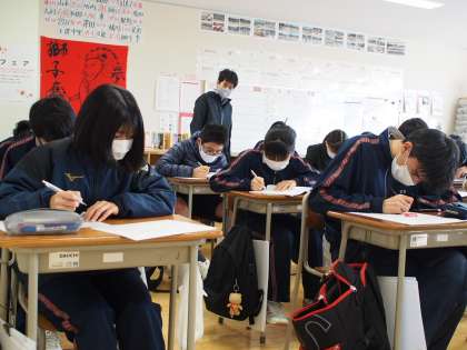 9期生の1時間目は都立高校願書の書き方を指導中。例示された用紙を見ながら丁寧に書いていきます。そして辞書で漢字を調べる場面も。願書を書くのは初めての人がほとんどですからね、自ずと慎重になるのもわかります。