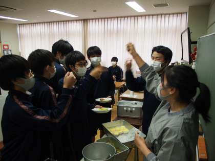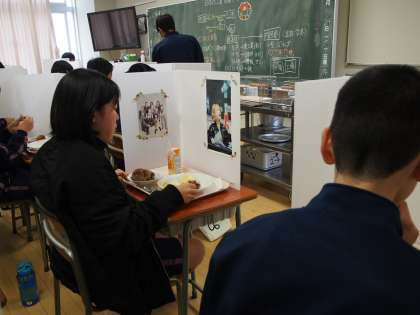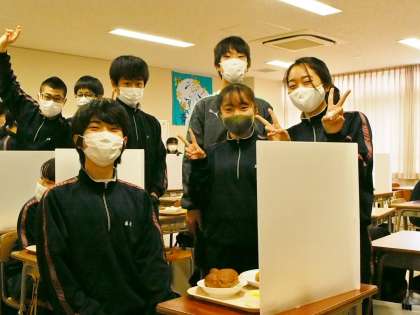 楽しみはもちろんあります。カメラを向ければ思わず笑顔でピース。残り1個のフライドチキンの争奪戦は真剣勝負。そして、パーテーションの内側をうまく活用して自分の世界を作っている生徒もいました。みんなたくましい!