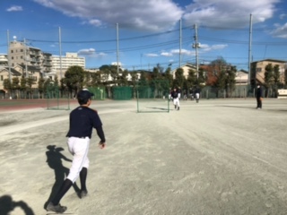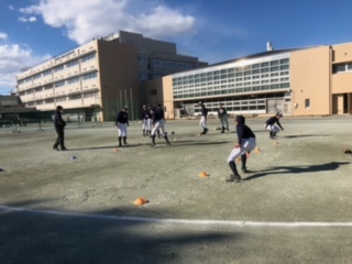 寒い冬のアップは楽しくて汗がかけるゲーム形式で行います。今日はボール取り競争。キャッチボールも状況を設定して頑張りました。