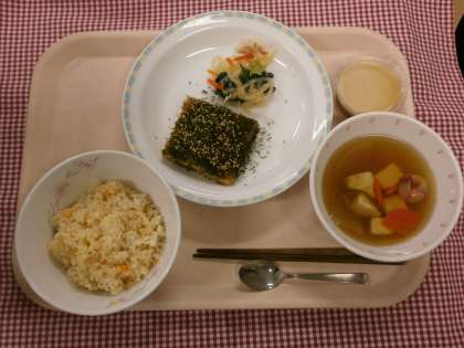 主食は、おせちでも食べられている「松風焼き」です。松風焼きは、鶏ひき肉を調味料と合わせて焼いた料理で、表に青のりやごまを振りかけて食べます。裏には何もかけず、裏が寂しいことから「裏がない=隠し事のない」という意味で「隠し事のない、正直な生き方をしていきたい」という願いがこもっているそうです。フナキボ生の皆さんも、「今年も裏がなく真っすぐに生きていこう!」という気持ちを込めて、ぜひ残さず食べましょう。