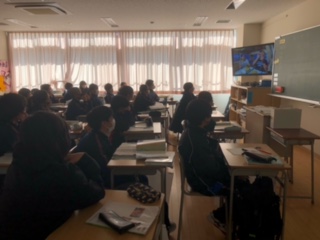 1-6の地理の授業ではアメリカの文化の学習をしました。特大ハンバーガーを食べるユーチューバーの動画から、なんでアメリカの食事は大きくなっていったのかを考えました。