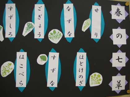 暦の上では来月になると「春」をむかえます。もちろんまだまだ極寒の日が続きますが、給食の掲示板には早くも「春の七草」の掲示がでました。そして、職員室にはその実物見本も置いてあります。