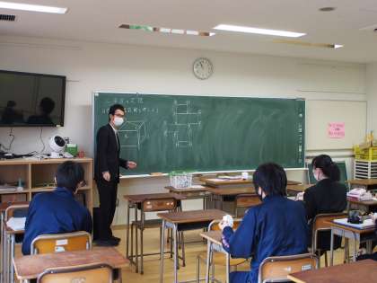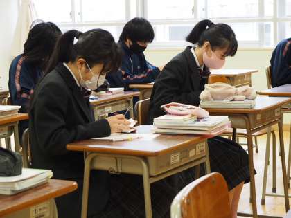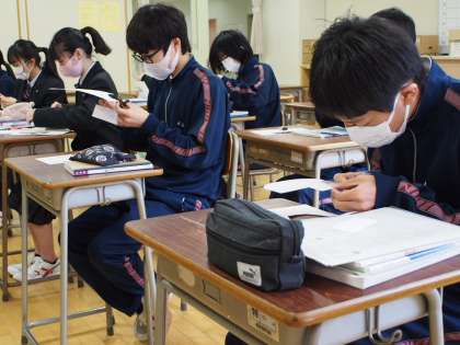 9期生の数学は、図形の展開図を工作紙を使って立体的に作って確かめています。真剣な姿はやはり9期生ですね。