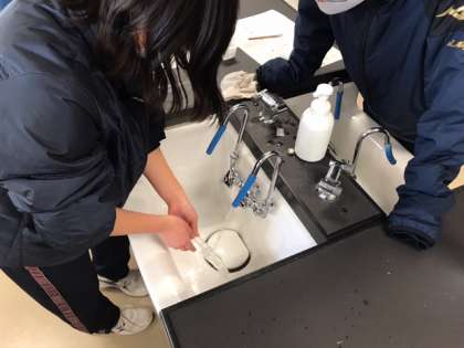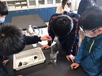 1年生の理科の授業です。溶解度と再結晶について、実験を行って学びます。塩化ナトリウムと硝酸カリウムを水に溶かしてから、熱したり冷やしたりしてどのように変化するか確認しています。再結晶した様子が予想外なことに驚きの声もあがっています。(副校長)