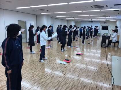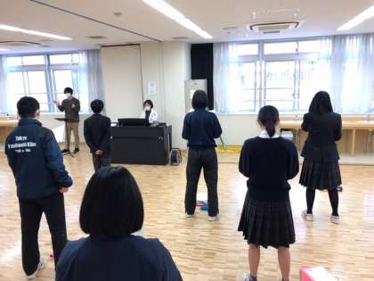 3年生の音楽の授業です。発声練習を音楽室で行った後、多目的ルームに移動して合唱の練習をしています。窓やドアを開けて、マスクを付けたまま、ルームいっぱいに広がってディスタンスをとって取り組んでいます。(副校長)