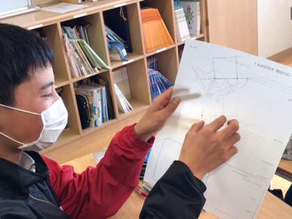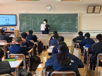 1年生の数学の授業です。平面図形の学習です。コンパスを活用し、野球場の本塁と一塁の位置が示された紙に、正方形になるように二塁と三塁を作図していきます。班で担当を決めて、次回はグラウンドで実際に作業を行います。(副校長)