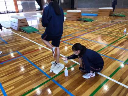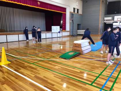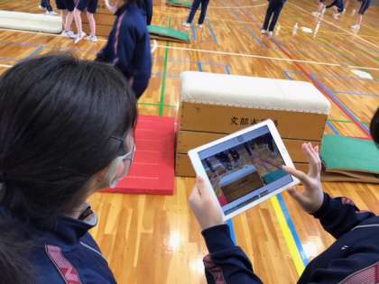 3年生の保健体育の授業です。跳び箱に取り組みます。跳ぶ前にはしっかりと靴を消毒します。また、自分の跳び方を、動画に撮ってもらって確認し、改善していきます。(副校長)