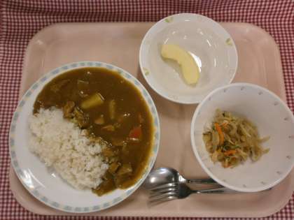 給食のカレーは、手作りで小麦粉とバターを炒めて作っています。また、りんごやチャツネなどを入れて甘みもプラスしています。味わって食べてください。