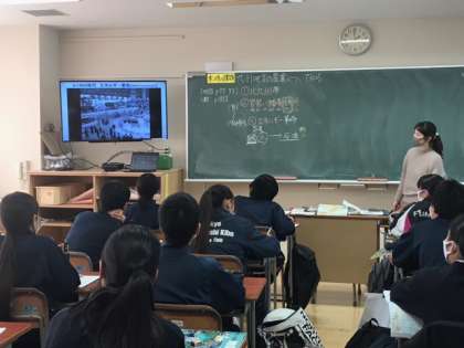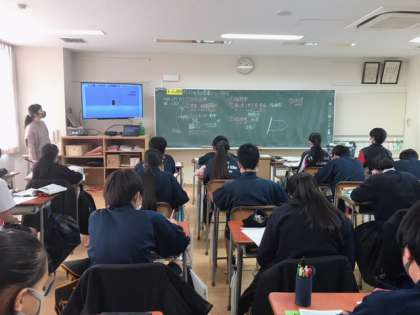 2年生の社会の授業です。九州地方の産業について学習します。八幡製鉄所や水俣など、動画を見ながら歴史的な背景を学び、産業の特色に迫ります。モニターに地図や写真も豊富に登場し、テンポよく授業が進んでいます。(副校長)