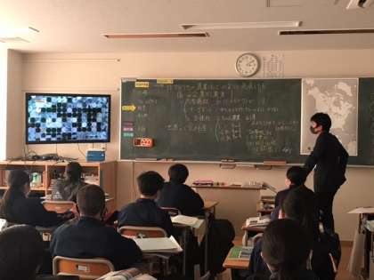 1年生の社会の授業です。北アメリカの農業について学習します。授業の途中にグラウンドにでて、広さを見ながら、日本の農家一人でこの5倍、アメリカは100倍くらいの耕地をもっていると知り、その広大さに驚きです。その後は教室に戻って、動画などを通して学習を深めます。(副校長)