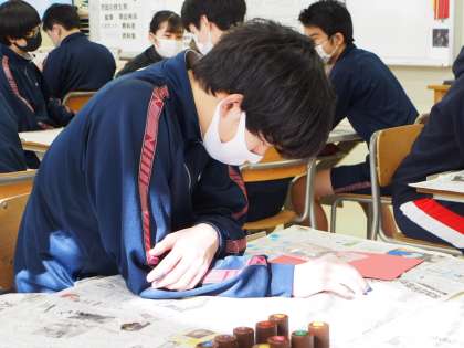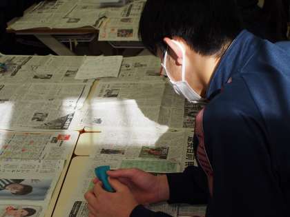 授業が始まる前、真剣に何かを読んでいる2人。なるほど、汚れ防止のために敷いた新聞紙の記事が目にとまったのですね。そうそう、こういう場面ってよくあるんです。NIEって奥が深いですね。