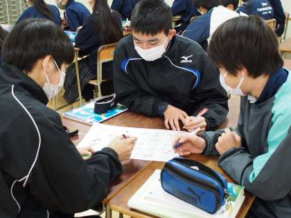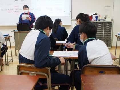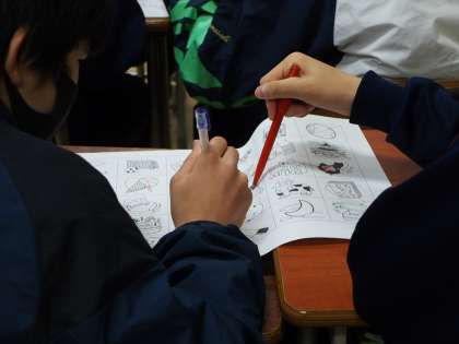 英語はもともと言語です。日常のあらゆるところで使われるもの。授業でも、様々な手法でアプローチします。今日は、早書きクイズ。関係代名詞に関する先生の文を聞いて、当てはまるイラストをいち早く見つけ早く〇をつけた方が勝ち〜!