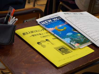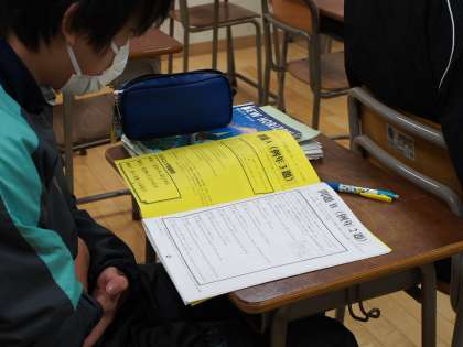 最後は、お手製の「リスニング試験必勝法」のプリントに取り組みます。黄色い表紙に、つくった3年の先生の愛情が感じられます。