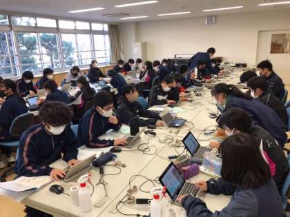 2年生の技術の授業です。前半はインターネット情報に関する専門用語を学びます。後半はエクセル実習として、各自のエクセルの表から作図されたグラフを見て、エクセルでできることを学習します。最後はPCやマウスを消毒して終わります。(副校長)