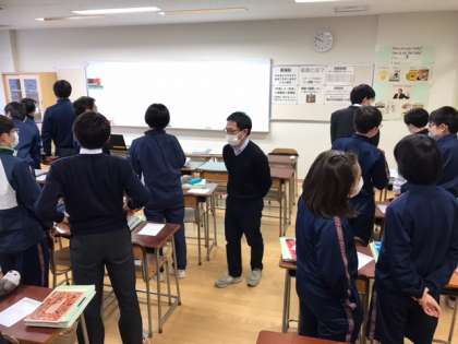3年生の英語の授業です。英会話、文法問題演習、リスニング、教科書と、盛りだくさんの内容です。入試直前、みんな頑張って取り組んでいます。写真は隣りの席の人と英会話のやりとりをするシーンです。3つ文章を使って話します。(副校長)