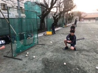 今日も短い1時間の練習でしたが、細かいことを意識して頑張りました。この写真は上半身の使い方を覚えるためにそんきょの姿勢でバッティングをしているところです。