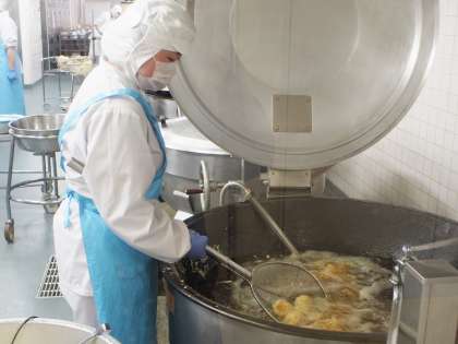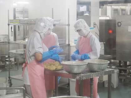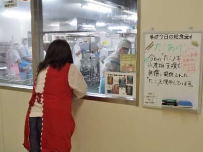 給食調理が見えるガラスに張りついている先生がいます。なになに?「水産庁の緊急補助支援による無償提供…」なんと、ありがたいことです!‘たこあげ’を食べることで、水産関係の方の気持ちを救うことができるなら、たくさん食べましょう。