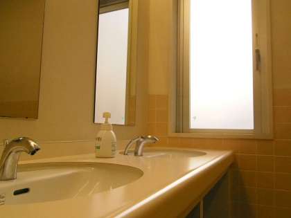 週末土日の部活動がないので、青空の校庭はちょっと寂しい感じがします。で、校舎を回ってみると、美化委員会のスローガンがありました。毎回、なるほど、と思わせる名スローガンばかり。委員会のこの姿勢が、フナキボ校舎がいつまでもきれいなままを保っていることに貢献しているのですね。週末でも、きちんと掃除がされていて、この男子トイレの洗面スペースも、まるでホテル並の美しさです。