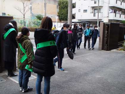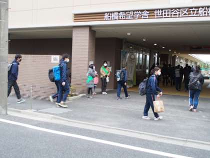 昨日の暖かさから一転、北風がふく中、2年2組の保護者の方が校門にたってフナキボ生をあいさつで出迎えていただいています。