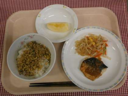 主菜は、「さばの梅みそかけ」です。梅干しには、疲労回復などに有効なクエン酸が含まれています。また、体に必要なミネラルもたっぷり入っていて成長期のフナキボ生にぴったりの食材の一つです。